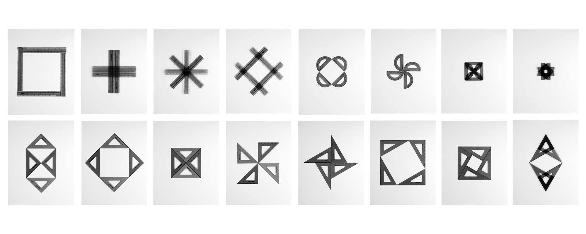 'Four Geometry Sets' consta de setenta y dos composiciones de sets de geometría realizadas con sólo cuatro elementos. Las figuras resultantes se tornan símbolos o letras de un código, de un alfabeto. Se concatenan, alinean, yuxtaponen y se superponen. Se busca el valor intrínseco de la forma geométrica para a continuación jugar con él.